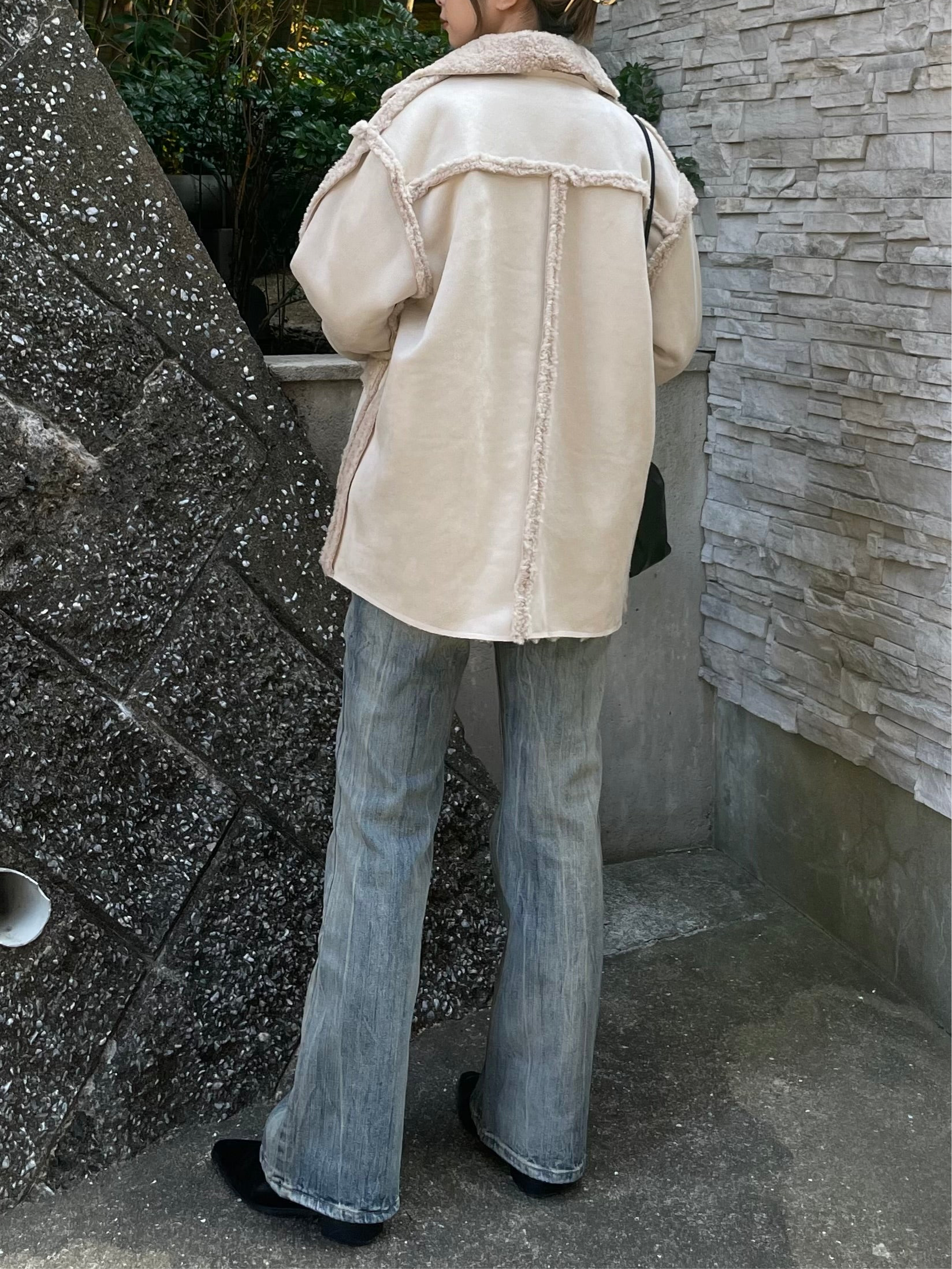 カジュアルな印象のあるムートンアウターですが、こちらはフロントボタンや大きめの襟、Aラインシルエットと上品な女性らしさが出るデザインがたくさん施されており、色気のあるムートンコートとなっております。