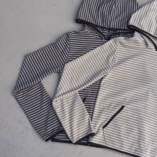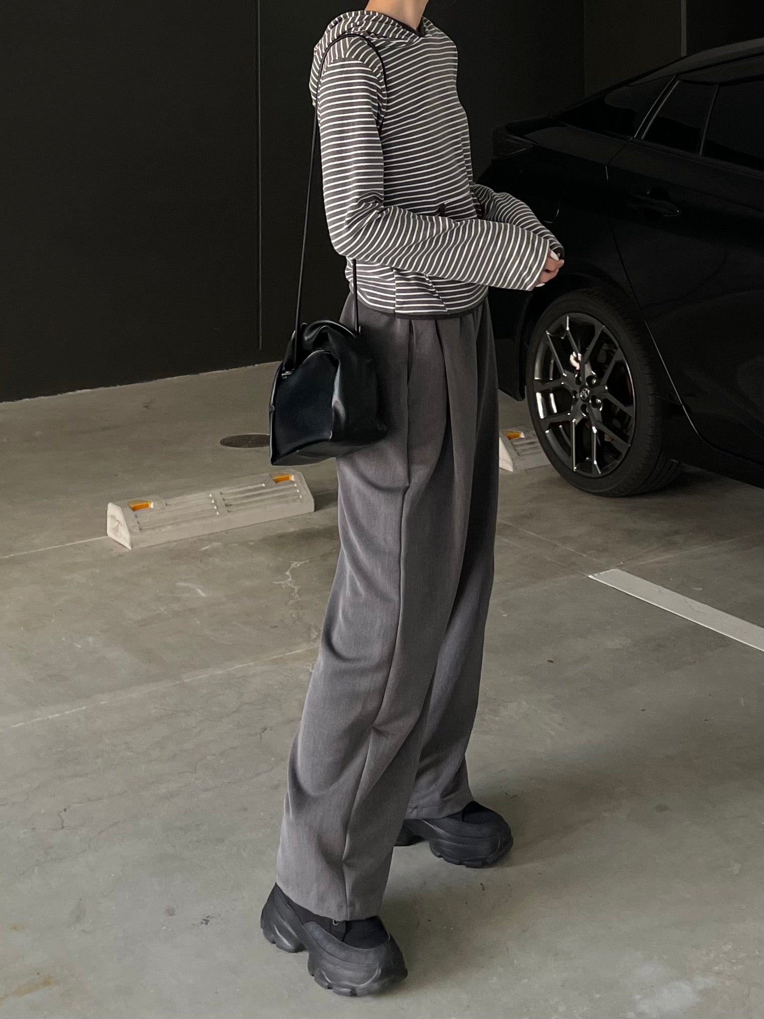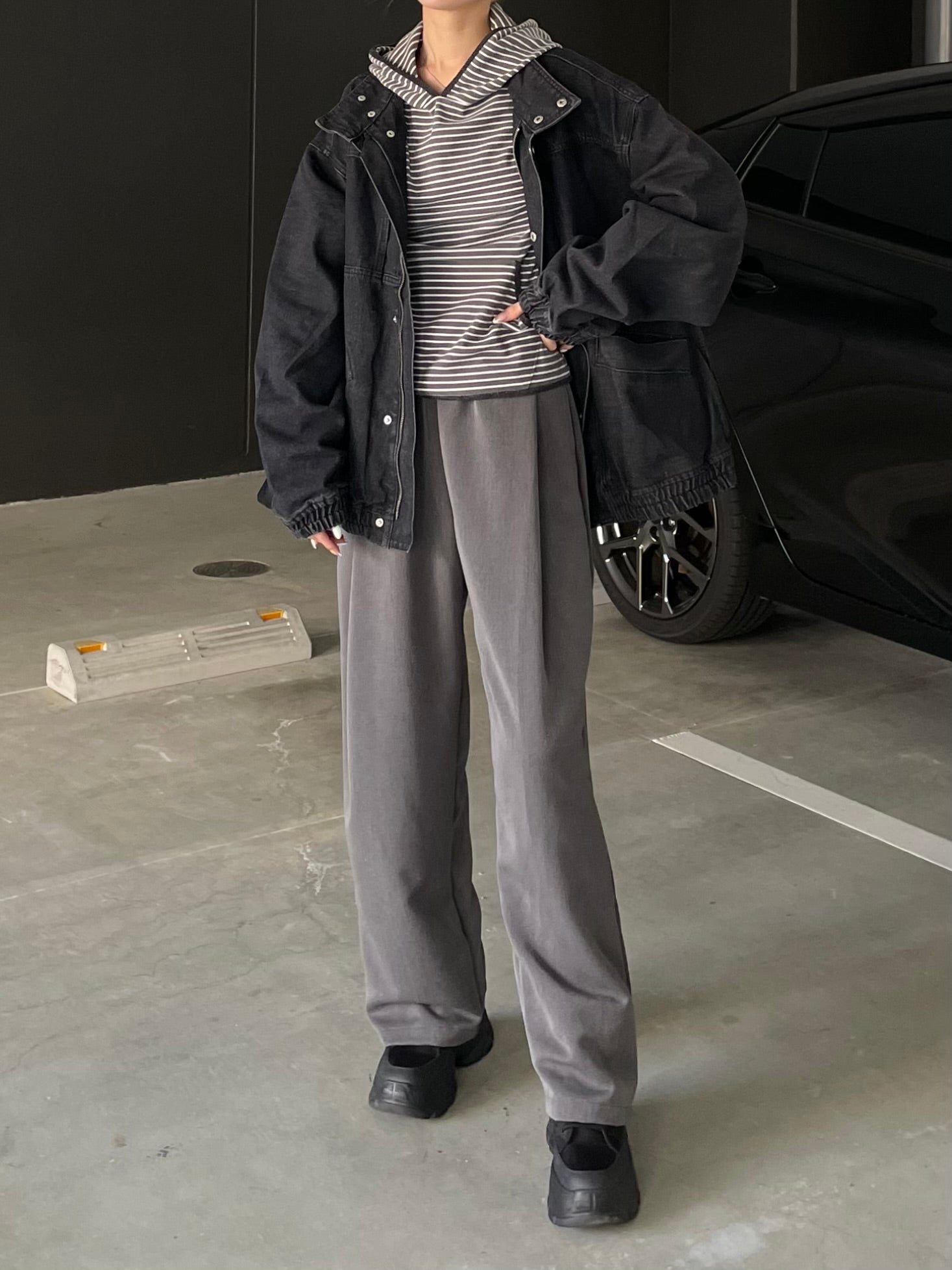 パーカーのようなデザインでカジュアル見えしますが、首元や袖のパイピングがブラックになっていることでクールな印象に。