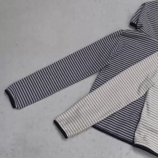 ボーダーは幼く見えることが懸念されますが、細めのボーダーと柔らかいカラーにすることで主張が弱まり大人な雰囲気で着ていただけます。