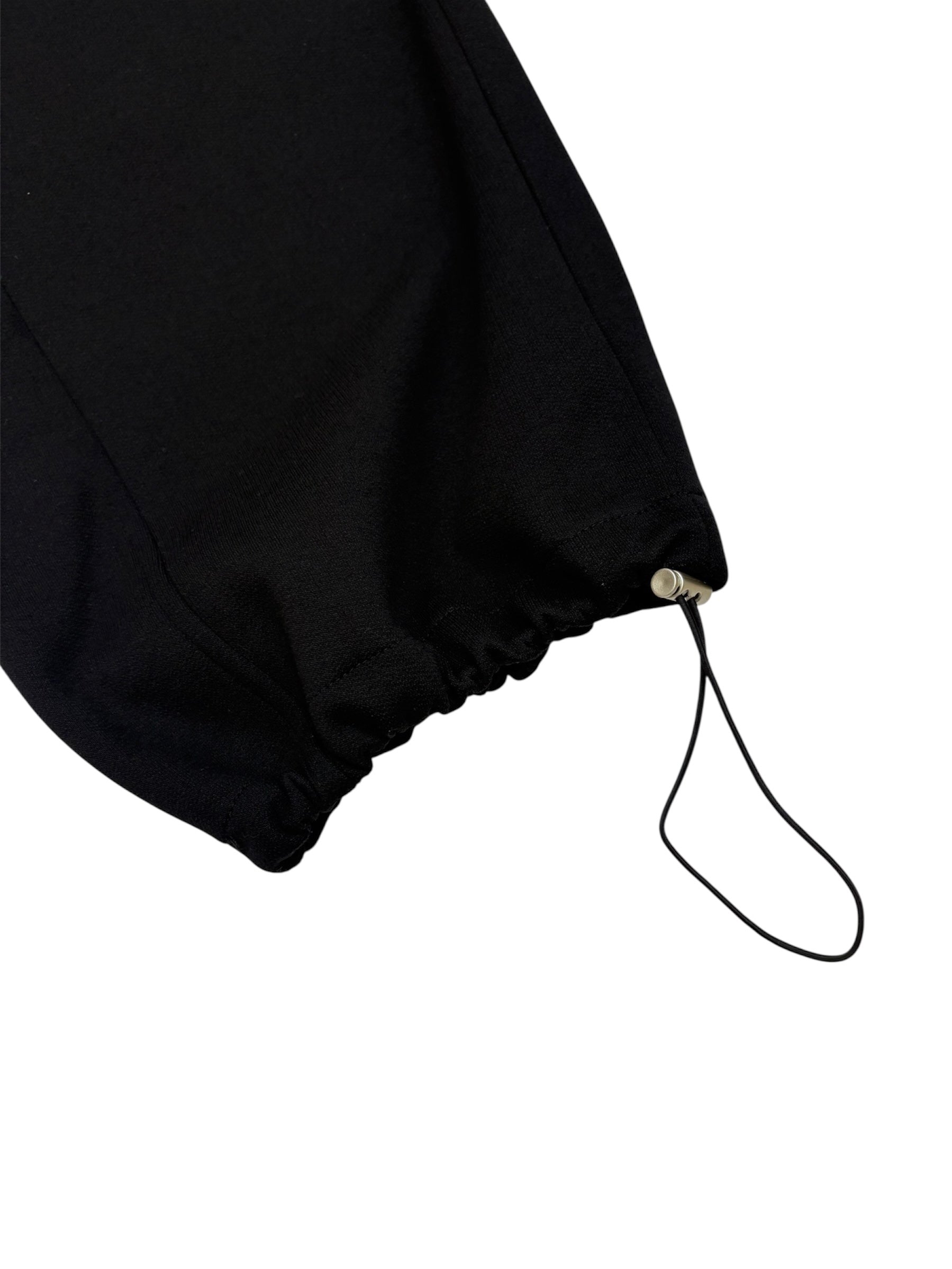 カーブシルエットが脚のラインをきれいに見せ、裾を絞ればジョガーパンツとしても着用可能。ウエストゴム仕様でリラックスでき、シンプルなトップスを合わせるだけでスタイルが決まります。