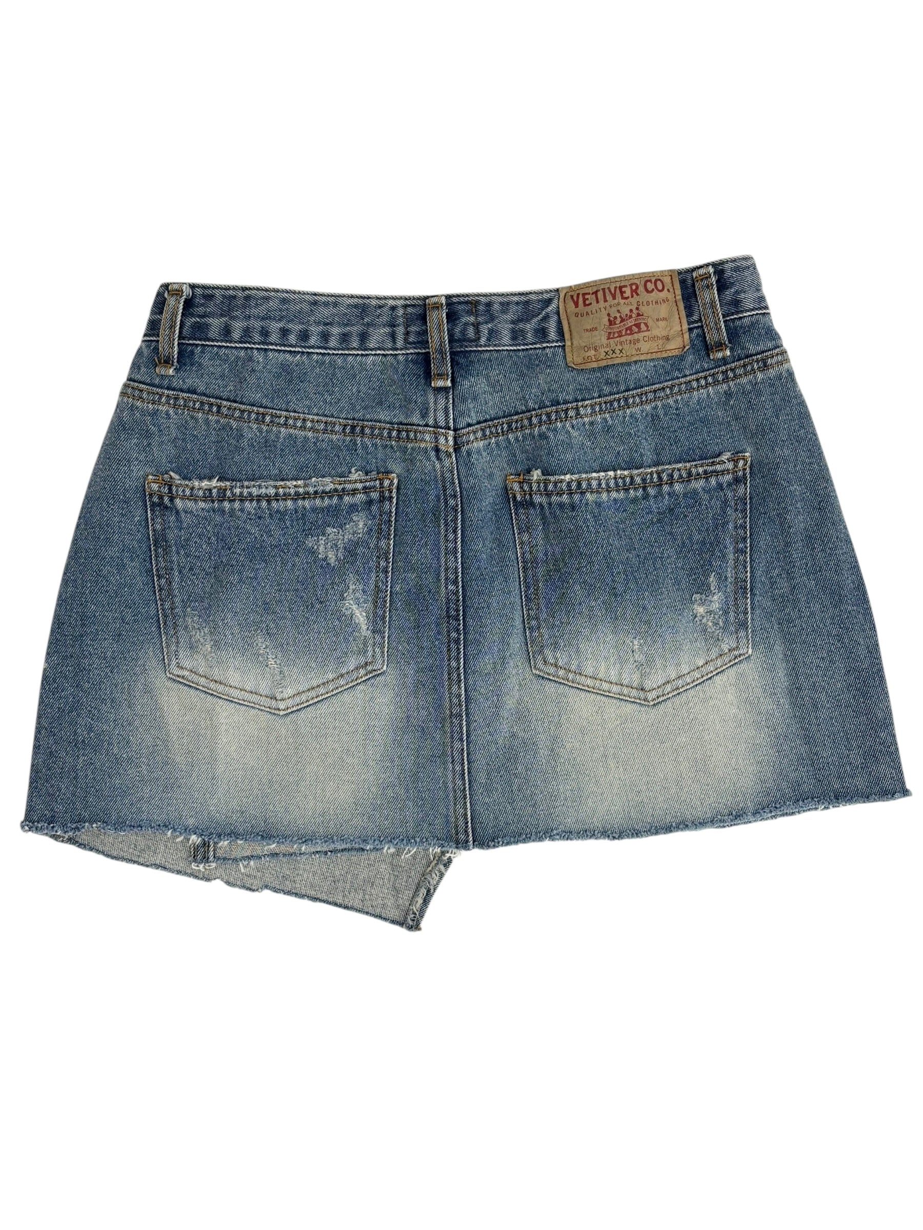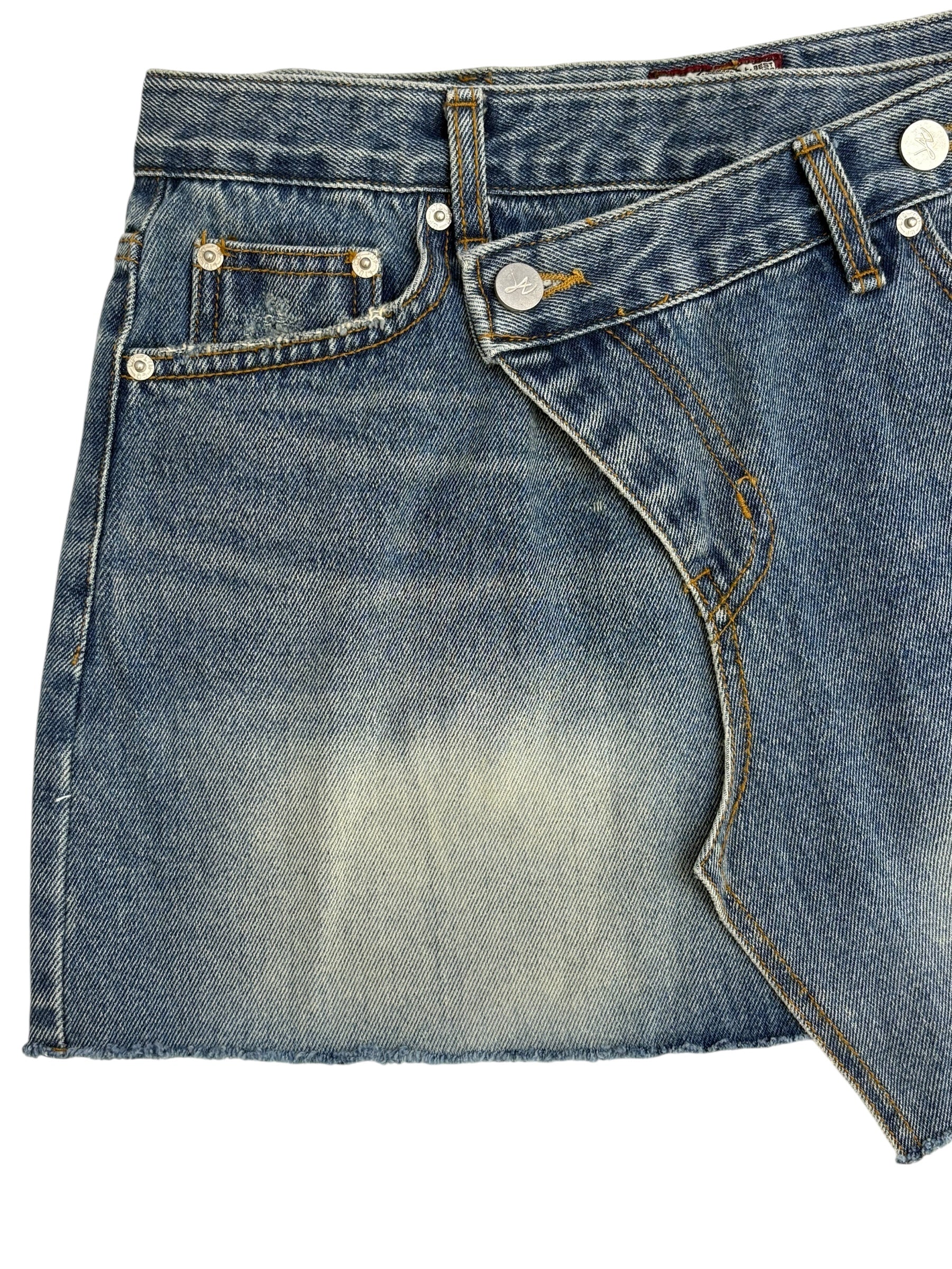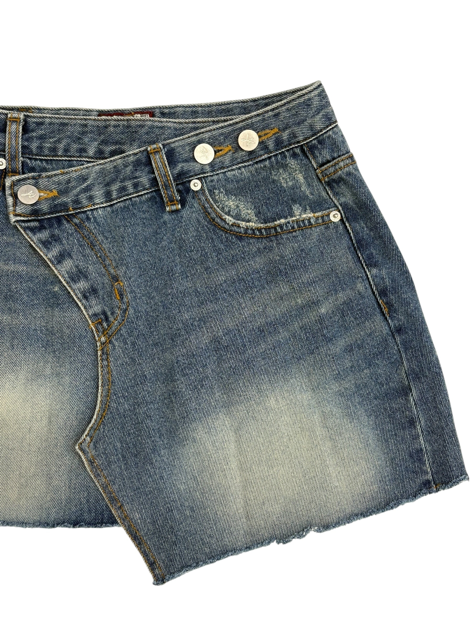 子供っぽくなりがちなデニムのミニスカートですが、ローウエスト・アシメデザインにすることで大人でも取り入れやすいスカートに。